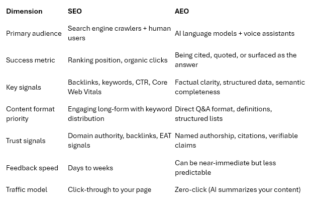 AEO answers a fundamentally different question: "How do I get an AI to choose my content as the authoritative answer to a question?"